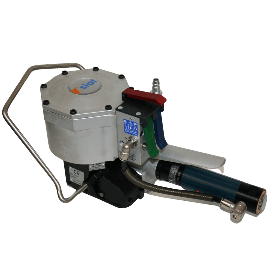 INCA is a SIAT pneumatic seal-less strapping tool for steel straps. It is a reliable strapping tool designed to use in medium/heavy duty industrial applications. It is equipped with two different tension motors. The tool is available as standard in 2 strap sizes: 16 mm and 19 mm.