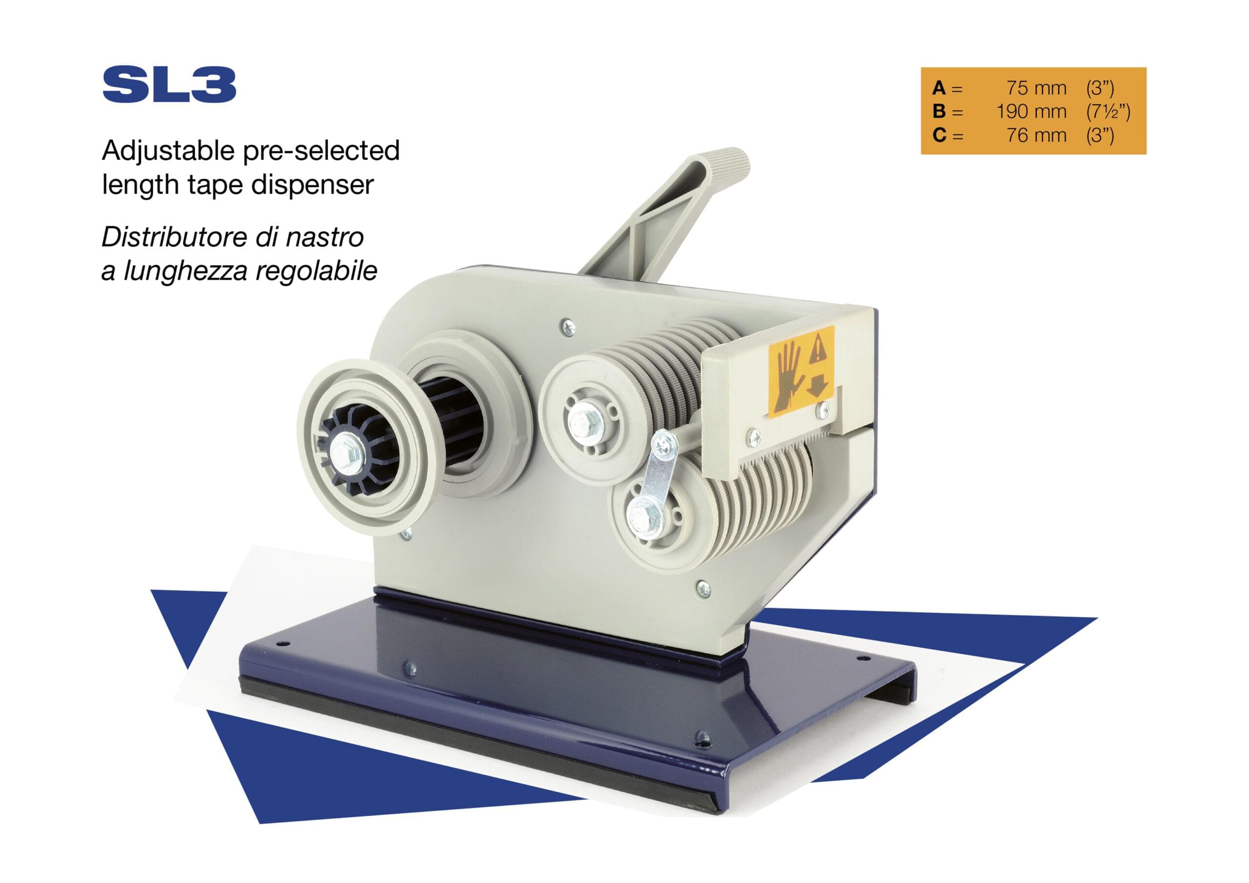 The SL3 is a pre-set length tape dispenser that uses a stamp width of 75 mm. Really useful for avoiding zeal wastage.