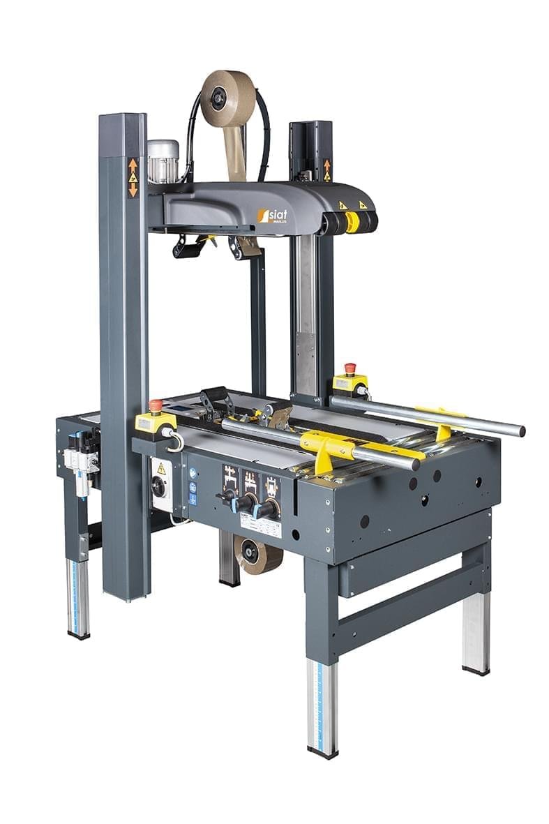 Semi-automatic case sealing machine designed and engineered by SIAT specifically for large random sized boxes. SR27 is the ideal case sealing machine for a variety of industries like E-commerce, Logistics, Electronics and Tissue. The machine consists of a metal structure epoxy painted and aluminium columns. The boxes sliding plan is made up of galvanized rolls and painted plate. The box preparation is made manually. The operator folds the top flaps and moves the box forward to the top head yellow button. The top head moves upwards - till the yellow button is pushed - to reach the required box height. After reaching the right position, the operator is able to move the box inside the machine until it is taken away by the double belt conveyor.