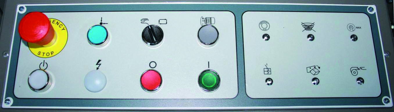 • Πίνακας ελέγχου εξοπλισμένος με: μετρητή κιβωτίων – χρονοδιακόπτη κιβωτίων, συναγερμό χαμηλής αποθήκευσης κιβωτίων, συναγερμό φρένου/τέλους ταινίας, συναγερμό πλήρους γραμμής μετά το μηχάνημα.