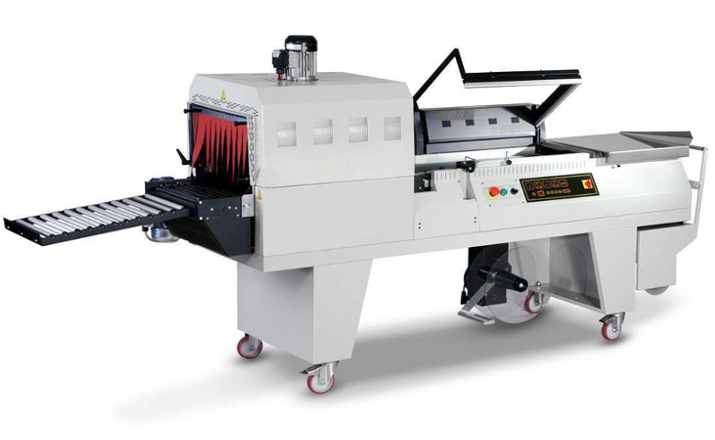 Ημιαυτόματη μηχανή συσκευασίας εξοπλισμένη με μεταφορικό ιμάντα και ενσωματωμένη σήραγγα θερμοσυρρίκνωσης με μεταφορέα εξόδου. Μηχανή κατάλληλη για υψηλότερη παραγωγή και για τις περισσότερες εφαρμογές.